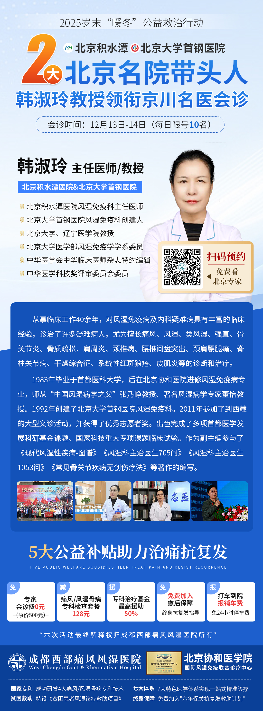 12月13日-14日,成都西部痛风风湿医院将举办2025岁末“暖冬”公益救治行动暨京川名医联合会诊专场。本次活动特邀<北京积水潭医院与北京大学首钢医院两大顶级名院的风湿免疫科带头人>亲临蓉城,携手川内专家团,为广大痛风、风湿骨病患者带来专业诊疗与康复希望。