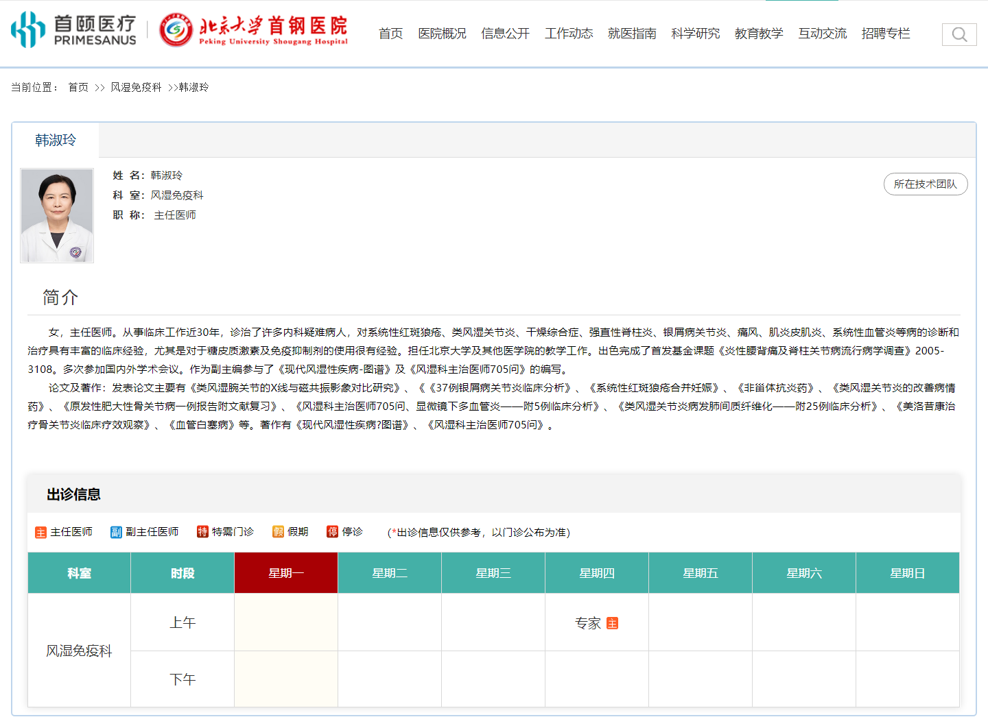 提到风湿免疫病诊疗,韩淑玲教授的名字在患者圈里早已是“金字招牌”。她深耕领域40余年,同时执掌北京两大顶级医院风湿科核心诊疗工作,既是北京积水潭医院的临床中坚,更是北京大学首钢医院风湿免疫科的“奠基人”,让无数疑难患者重获关节自由。