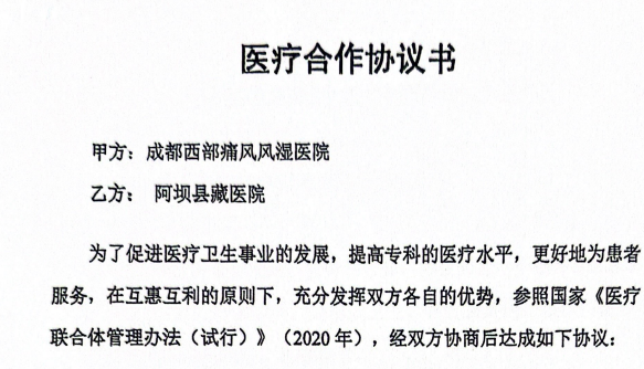 2026年1月30日,成都西部痛风风湿医院与阿坝县藏医院达成医疗合作,共建医疗联合体。
