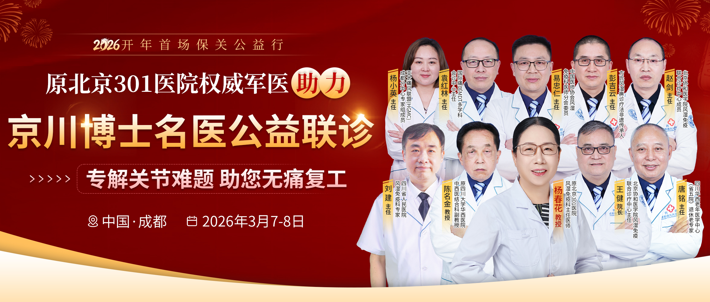 为帮助广大患者抓住年后诊疗黄金期,成都西部痛风风湿医院正式启动「2026开年首场保关公益行」,特邀原中国人民解放军总医院(北京301医院)风湿免疫科权威专家杨春花教授亲临成都,领衔京川博士名医团,为痛风、风湿骨关节病患者提供精准诊疗方案,助力大家无痛复工、安心生活。