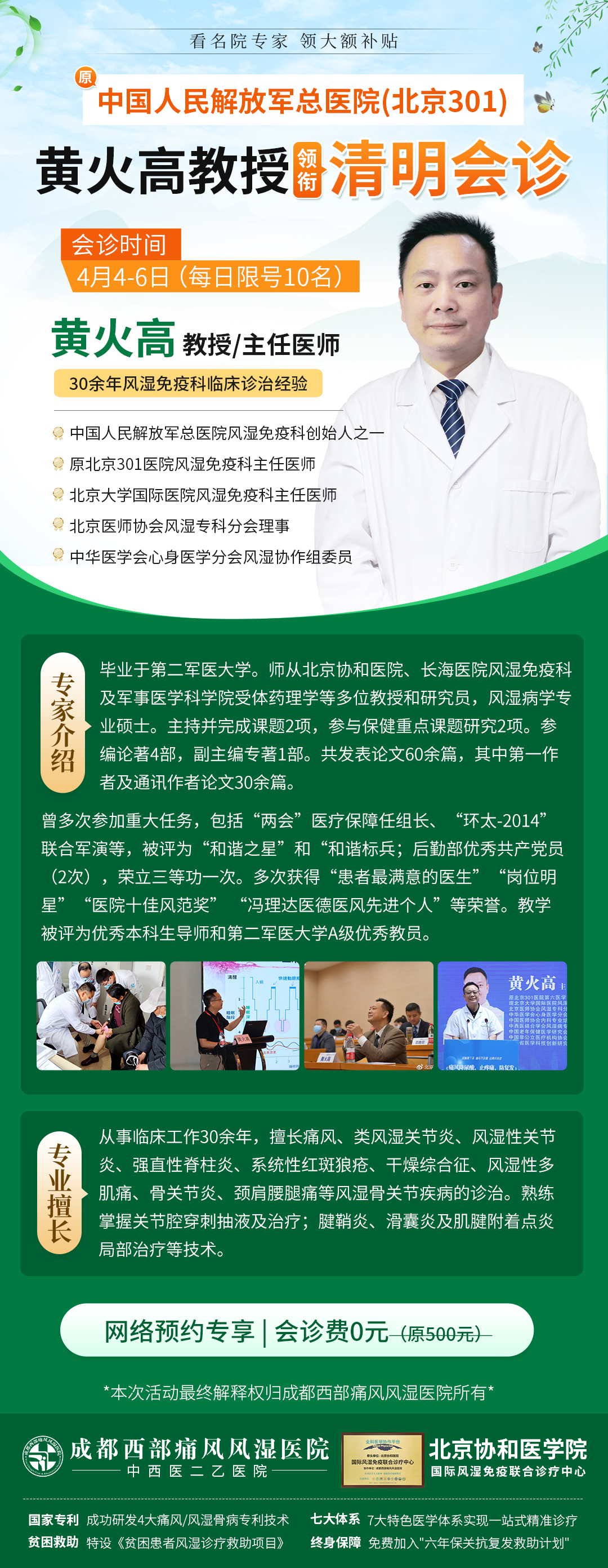 好消息!这个清明,为让大家摆脱疼痛,成都西部痛风风湿医院特别开启「京川三甲名医清明专场公益联诊」,原中国人民解放军总医院(北京301医院)风湿免疫科主任医师——黄火高教授领衔会诊,不用跑北京、不用抢号,在家门口就能享受国家级精准诊疗,更有5大公益补贴直击就医痛点,帮你少花钱、看好病!